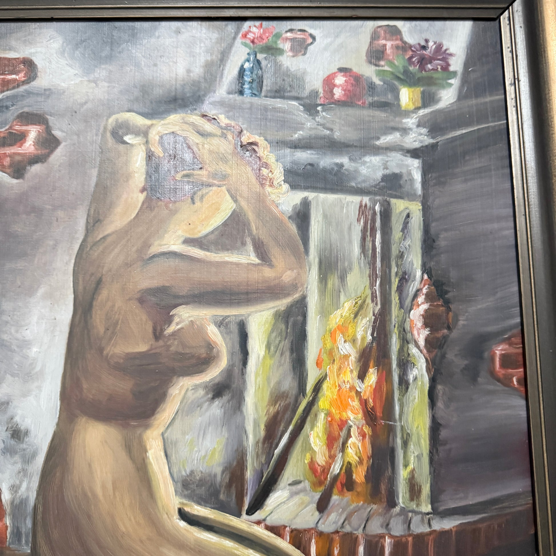 A striking figurative composition from post-war Sweden, painted in 1947. The work depicts a seated nude figure by a glowing fireplace, rendered with expressive, confident brushstrokes. Warm ochres and earthy browns dominate the palette, contrasted by the vivid flames and cooler grey tones of the interior.