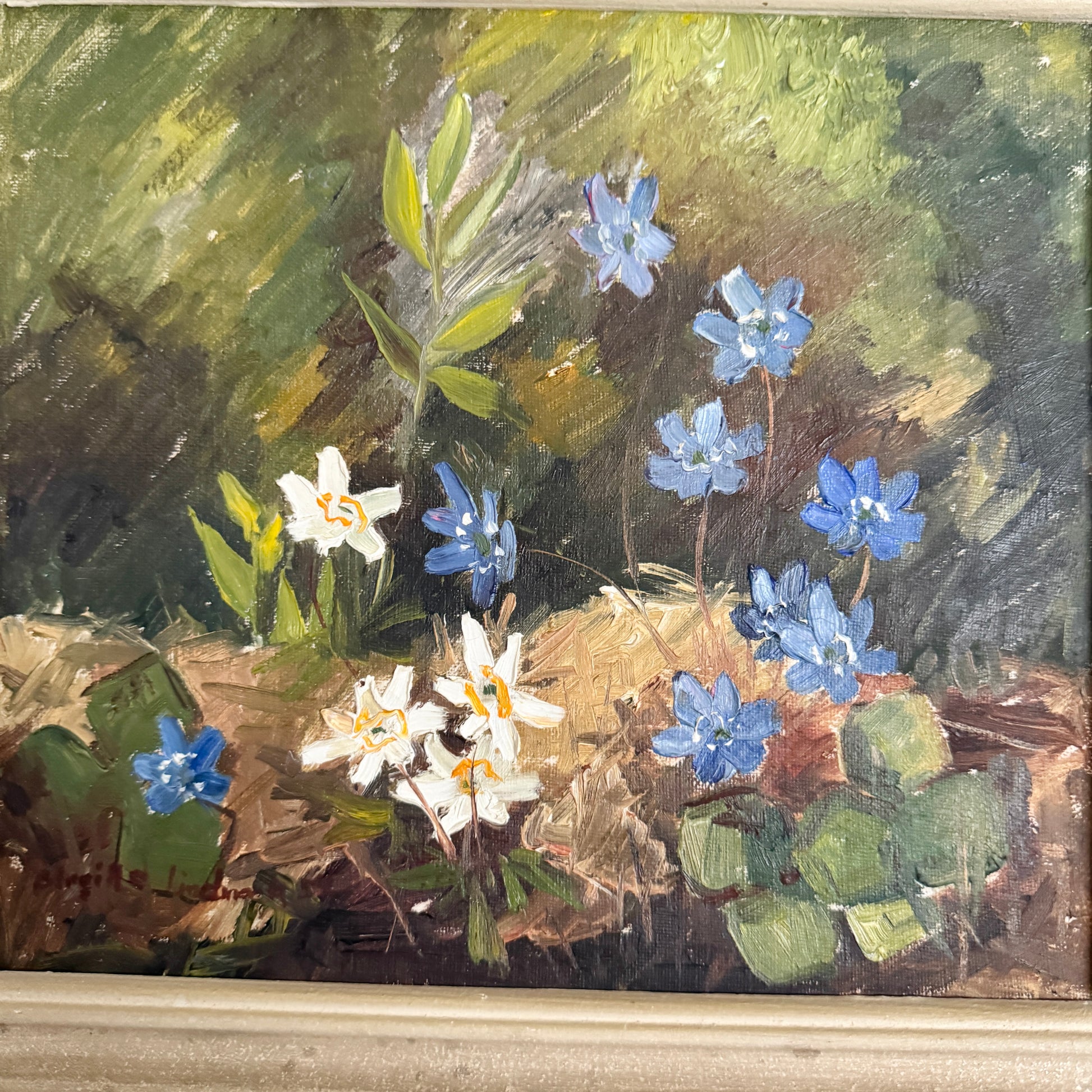 A charming vintage oil painting by Swedish artist Birgitta Lindmark, capturing the gentle awakening of spring in the Nordic forest. Blue and white anemones bloom against a backdrop of fresh greens and earthy tones, painted with confident brushstrokes and a natural sense of light.