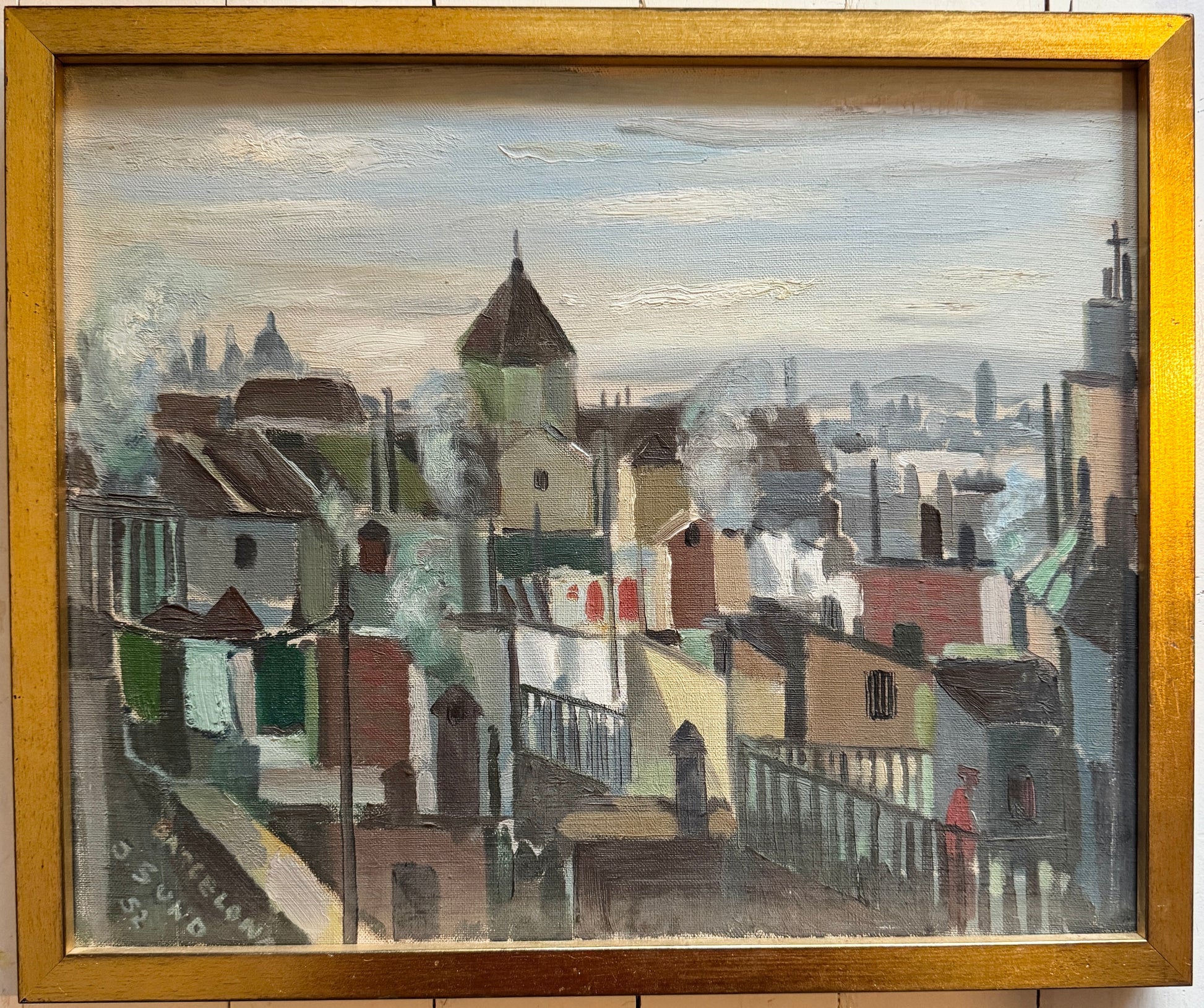Rather than focusing on landmarks, Sund captures the atmosphere of Barcelona: lived-in rooftops, narrow passages, and the hazy Mediterranean light that softens forms and dissolves edges. The result is a work that sits comfortably between modernism and lyrical realism, very much of its time yet timeless in mood.