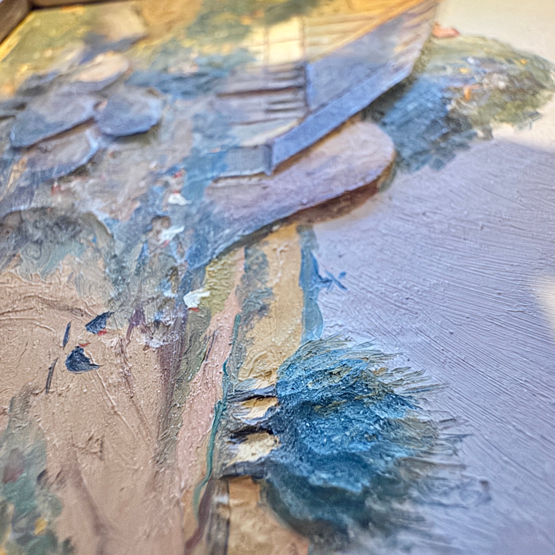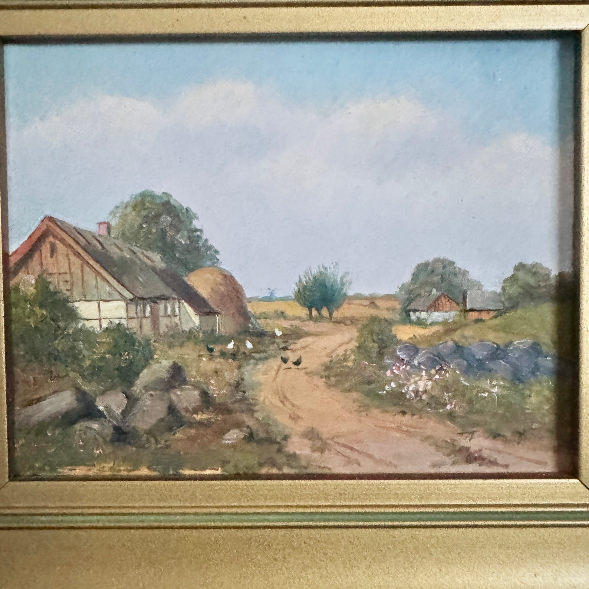 A delightful set of three small Danish oil paintings, each finely executed on carved wood panels and dated 1952. The artist, signed E.D., captures the quiet poetry of the rural Danish countryside, sunlit farmhouses, winding country roads, soft meadows, and distant roofs nestled among fields.