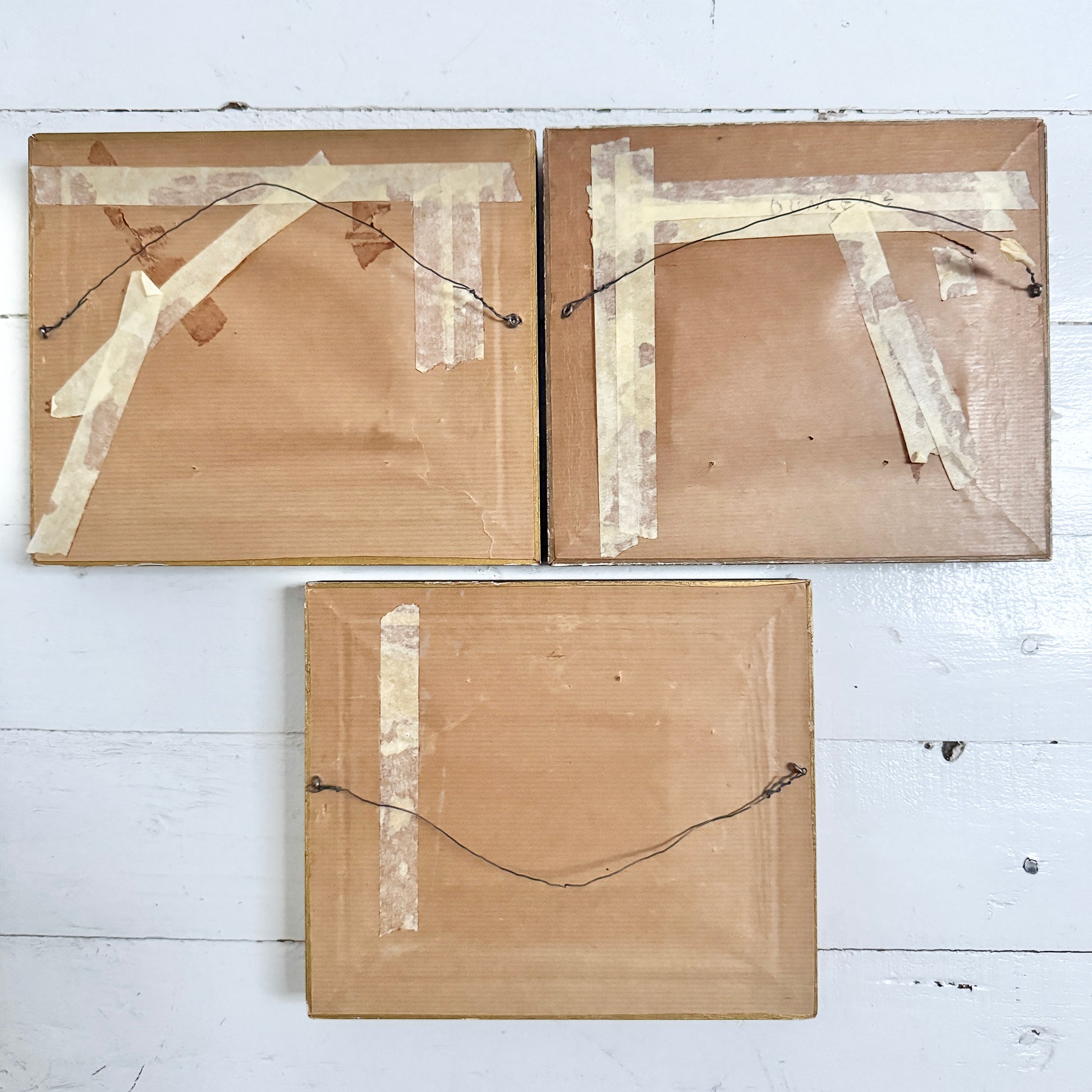 Each work is intimate in scale yet rich in detail, showcasing careful brushwork and a warm, nostalgic palette typical of mid-century Scandinavian realism. The carved wooden panels add an artisanal touch, enhancing the tactile charm of the paintings and making them feel both personal and handcrafted.