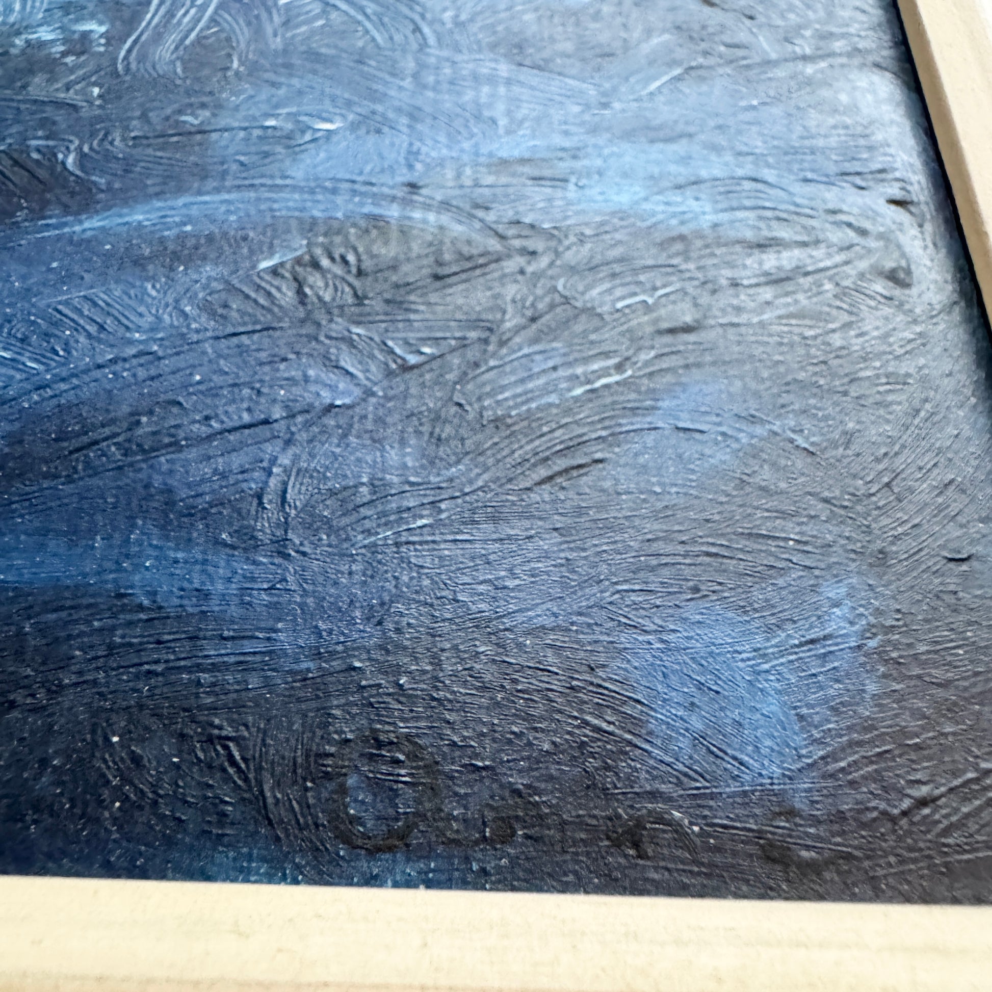 A striking small-scale oil painting by a Swedish artist, dating from the 1950s. Executed with confident, expressive brushwork, the composition balances abstraction and landscape, evoking a dramatic seascape or nocturnal scene. Deep blues dominate the surface, animated by sweeping, tactile strokes that suggest movement and depth, while accents of red, yellow, and white cut across the composition like distant lights or reflections.