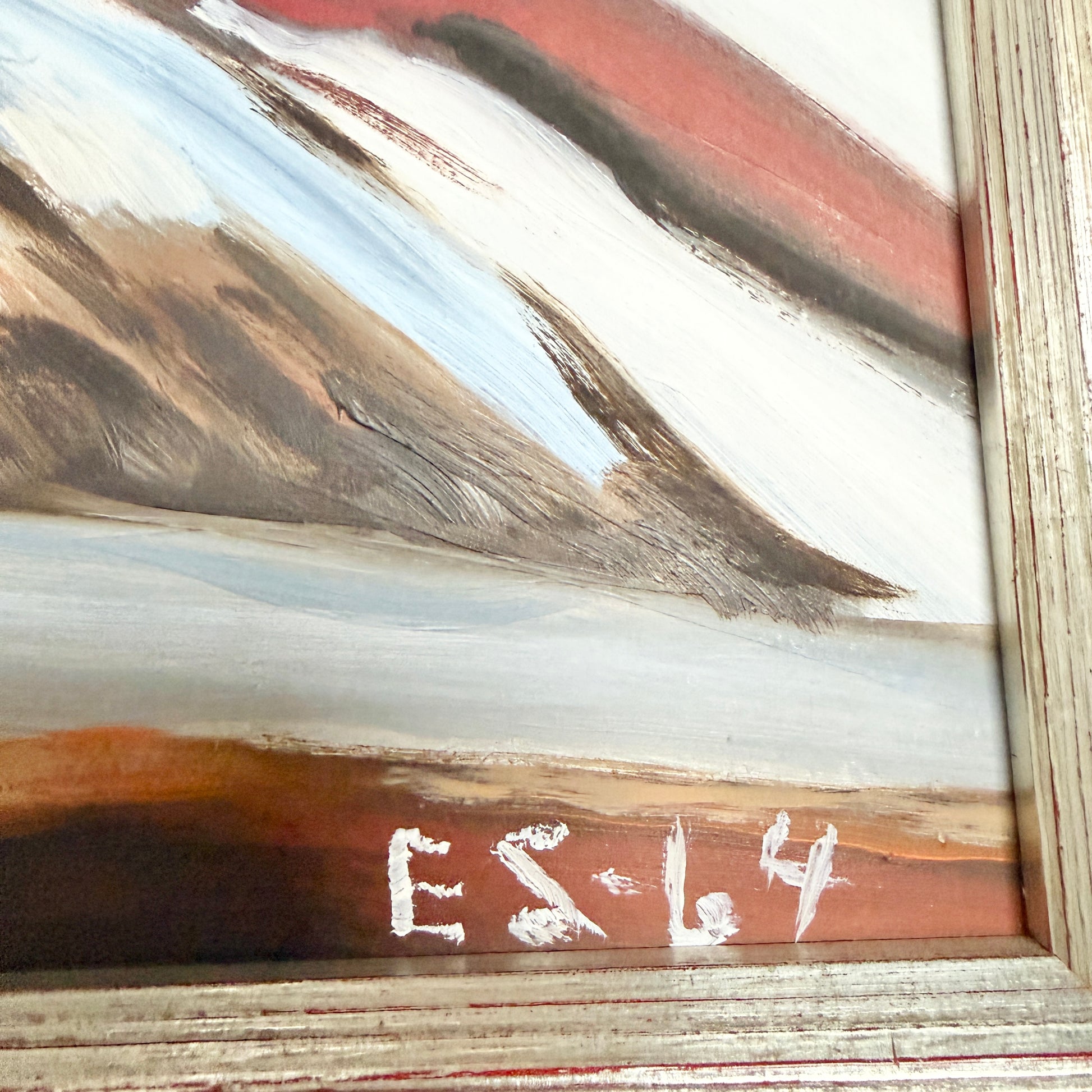 A striking Swedish oil painting from 1964, capturing the spirit of the Space Age through a bold and almost otherworldly winter landscape. Painted on board, the composition blends a rugged mountain terrain with sweeping, glacial forms that feel both terrestrial and cosmic. The central massif rises like a distant planet, its cool blues and whites contrasting dramatically against the fiery, mineral-rich foreground in tones of rust, ochre, and ember.