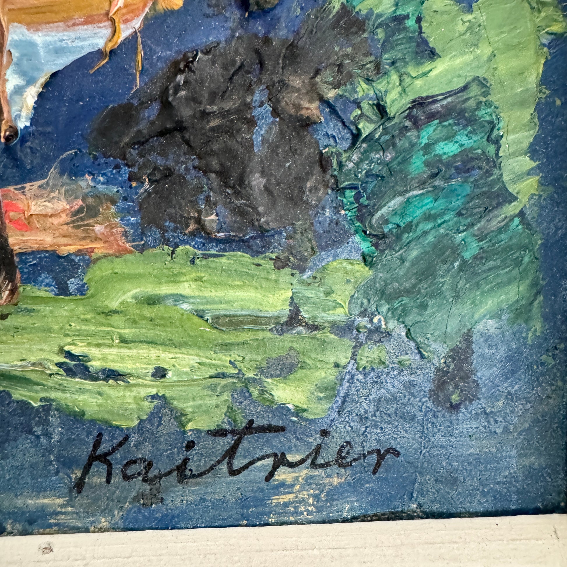 A lyrical composition by Kai Trier, where deep blue tones meet warm touches of yellow, red, and green. With textured layers and confident strokes, the scene hints at a landscape, perhaps houses under an expansive sky, yet remains beautifully abstract. The painting carries a quiet rhythm, a sense of movement and stillness intertwined, reflecting Trier’s subtle dialogue between color, form, and emotion.