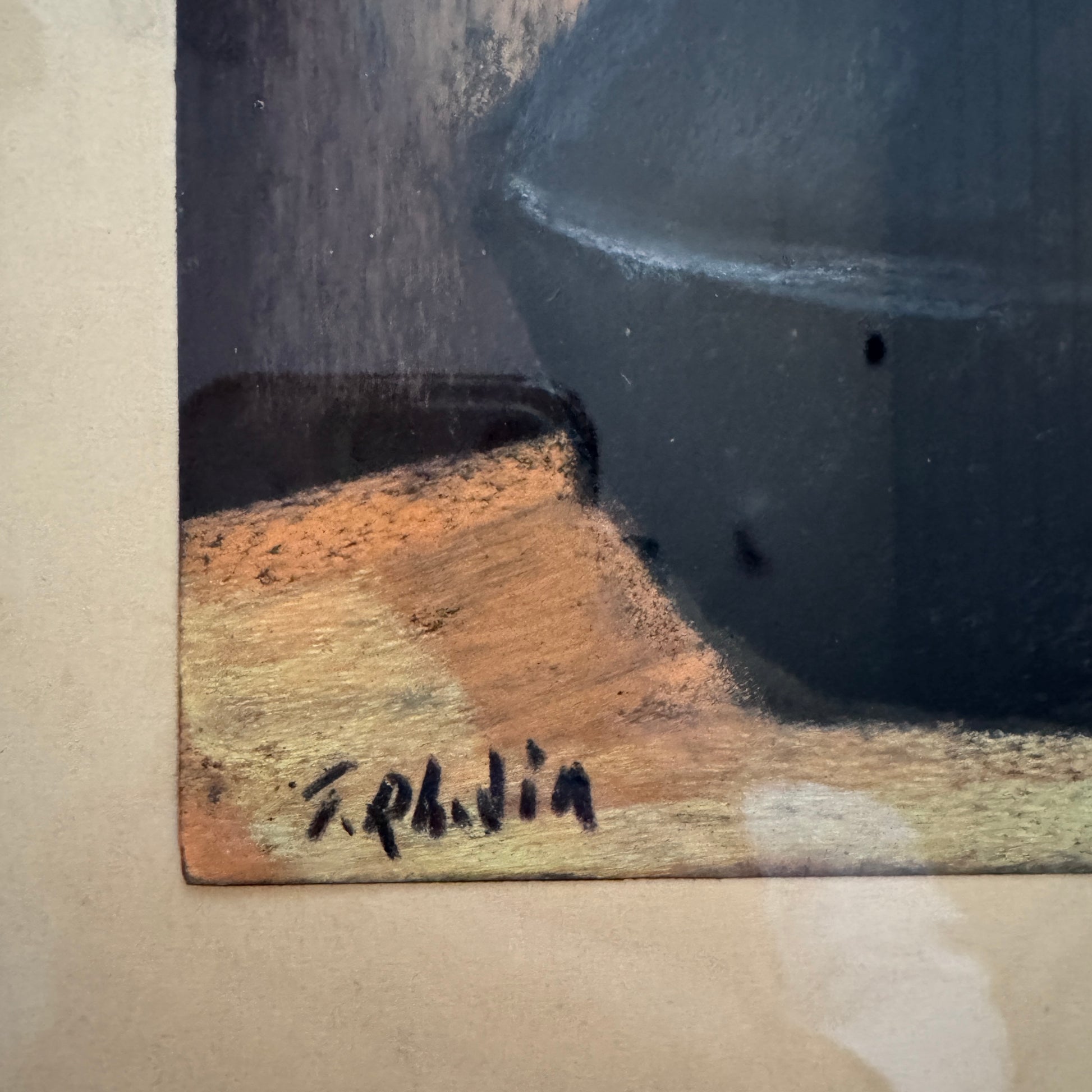 This atmospheric still life by Tedde Rhodin reflects the restrained modernism that marked Swedish art in the postwar decades. Executed in pastel, the composition centers on a cluster of dark grapes set against a muted interior, where deep browns and velvety blacks are contrasted by a softly glowing blue plate and warm ochre tones.