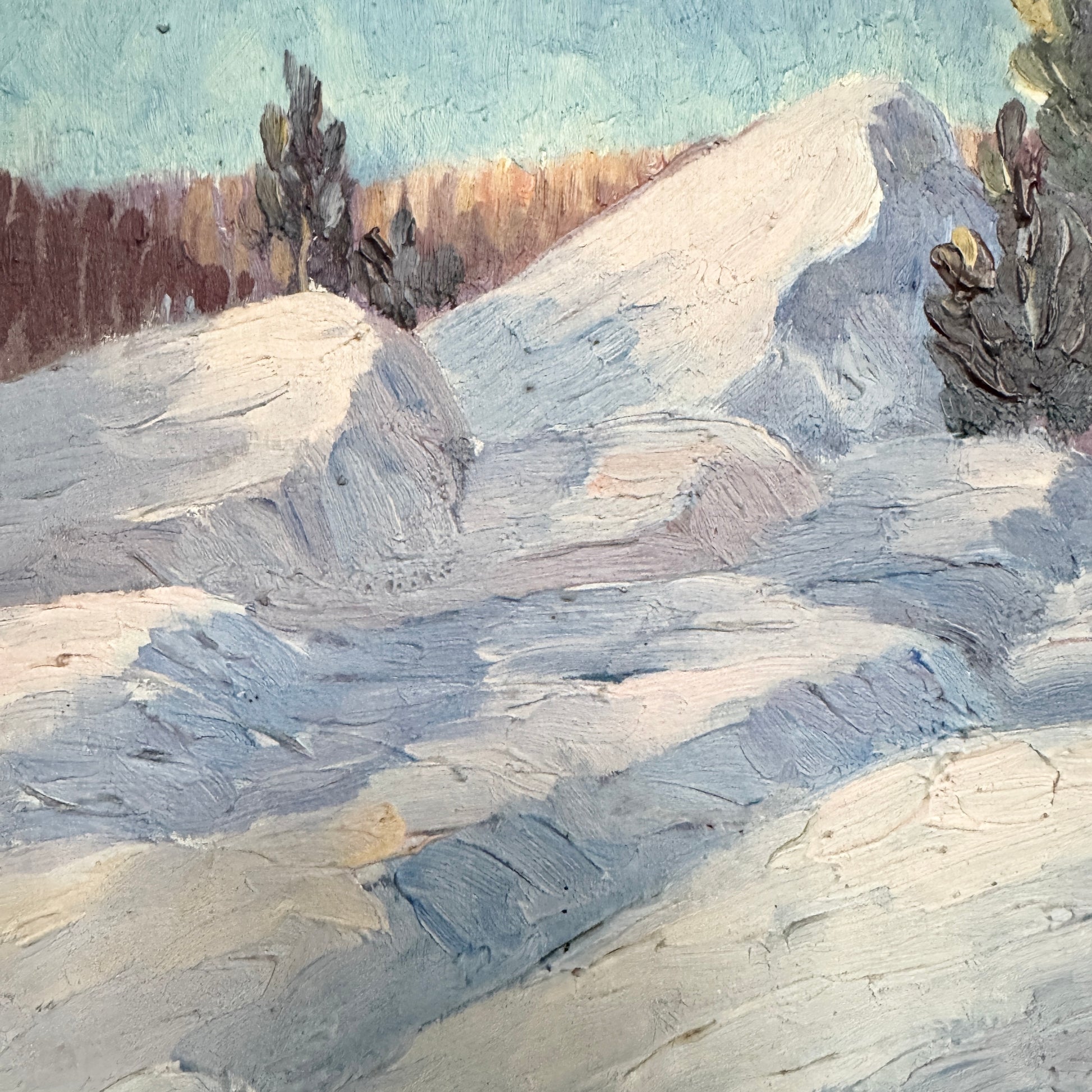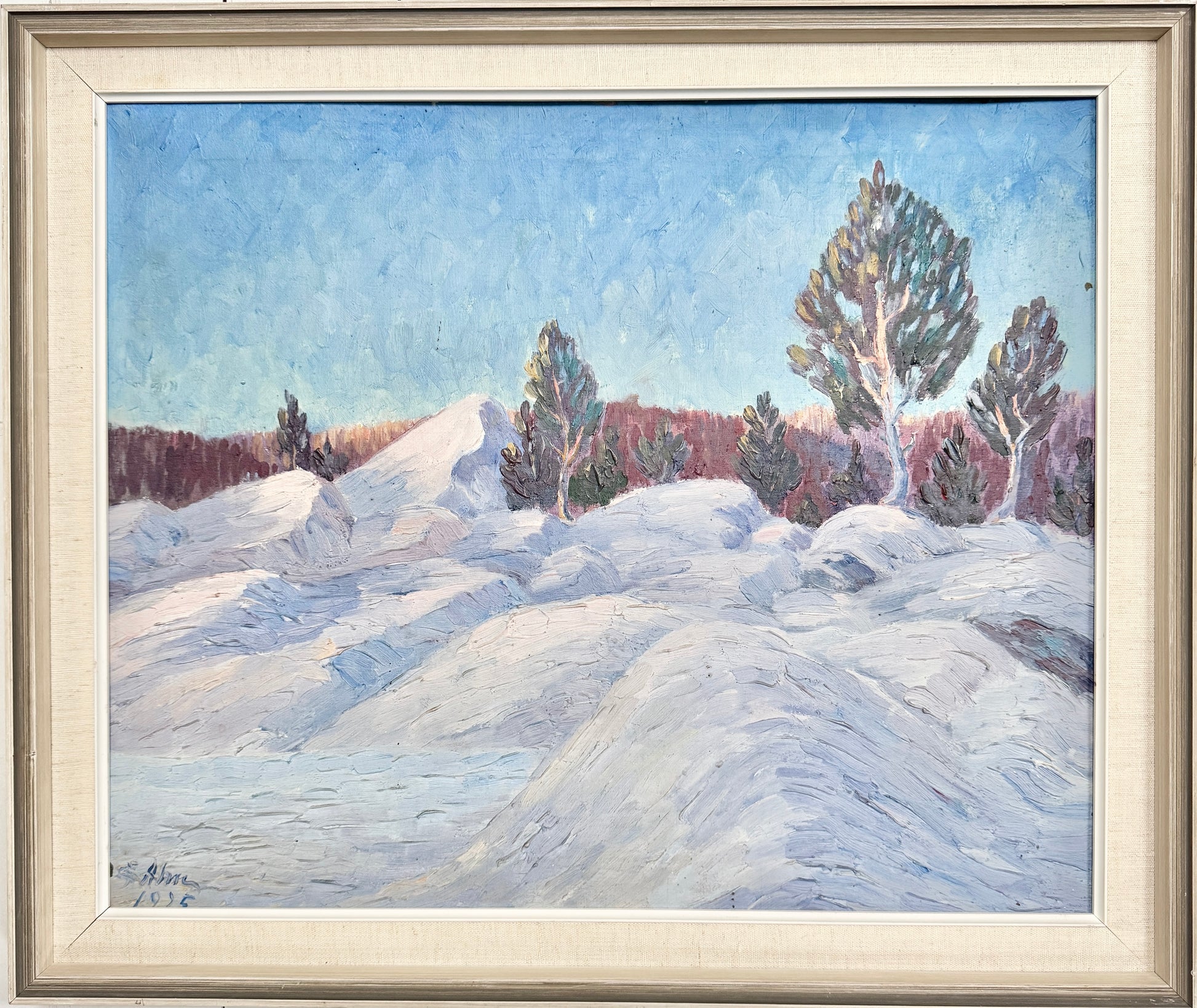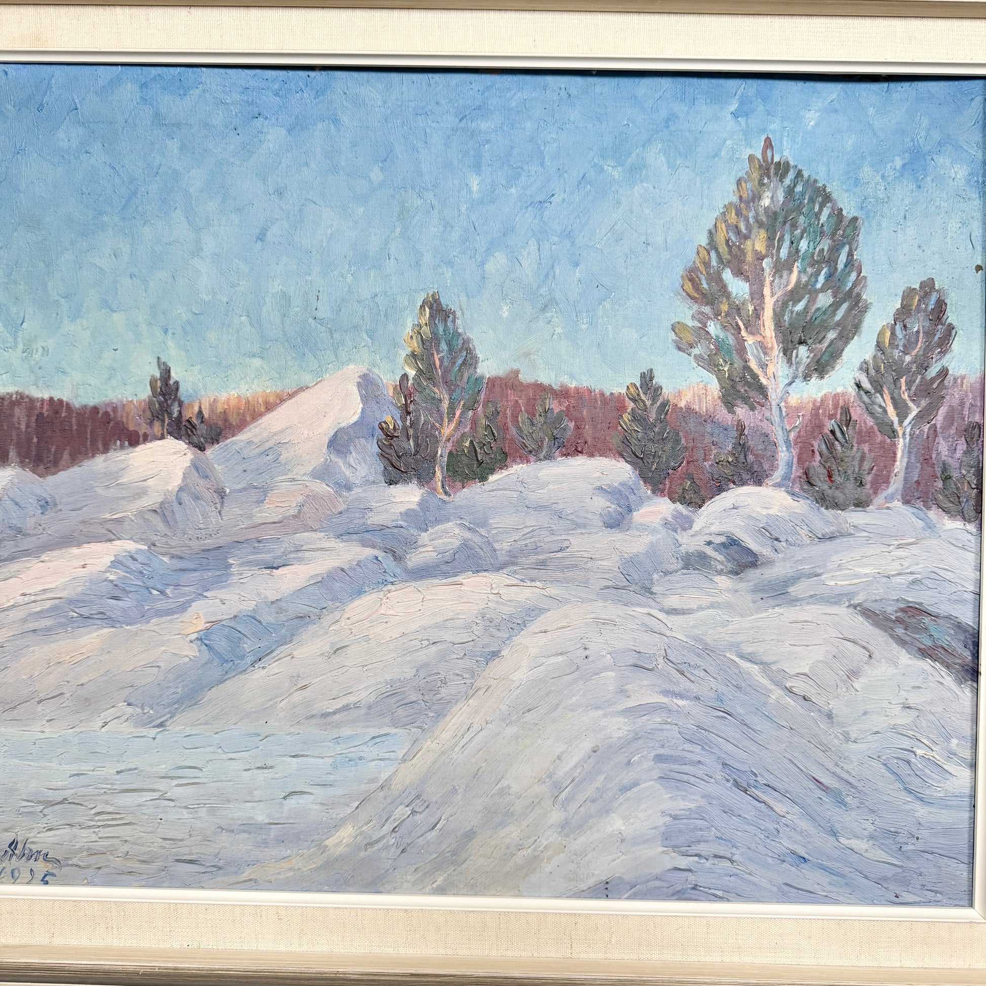 Painted in 1925, this evocative Swedish oil on board captures the quiet lyricism of the Nordic winter landscape. The artist approaches the motif with a gentle, almost impressionistic touch, allowing colour and brushwork to shape the atmosphere as much as the forms themselves. Snow-covered mounds roll softly across the foreground, their surfaces built up with lively, textured strokes that shift subtly between cool blues, lilacs, and pale whites.