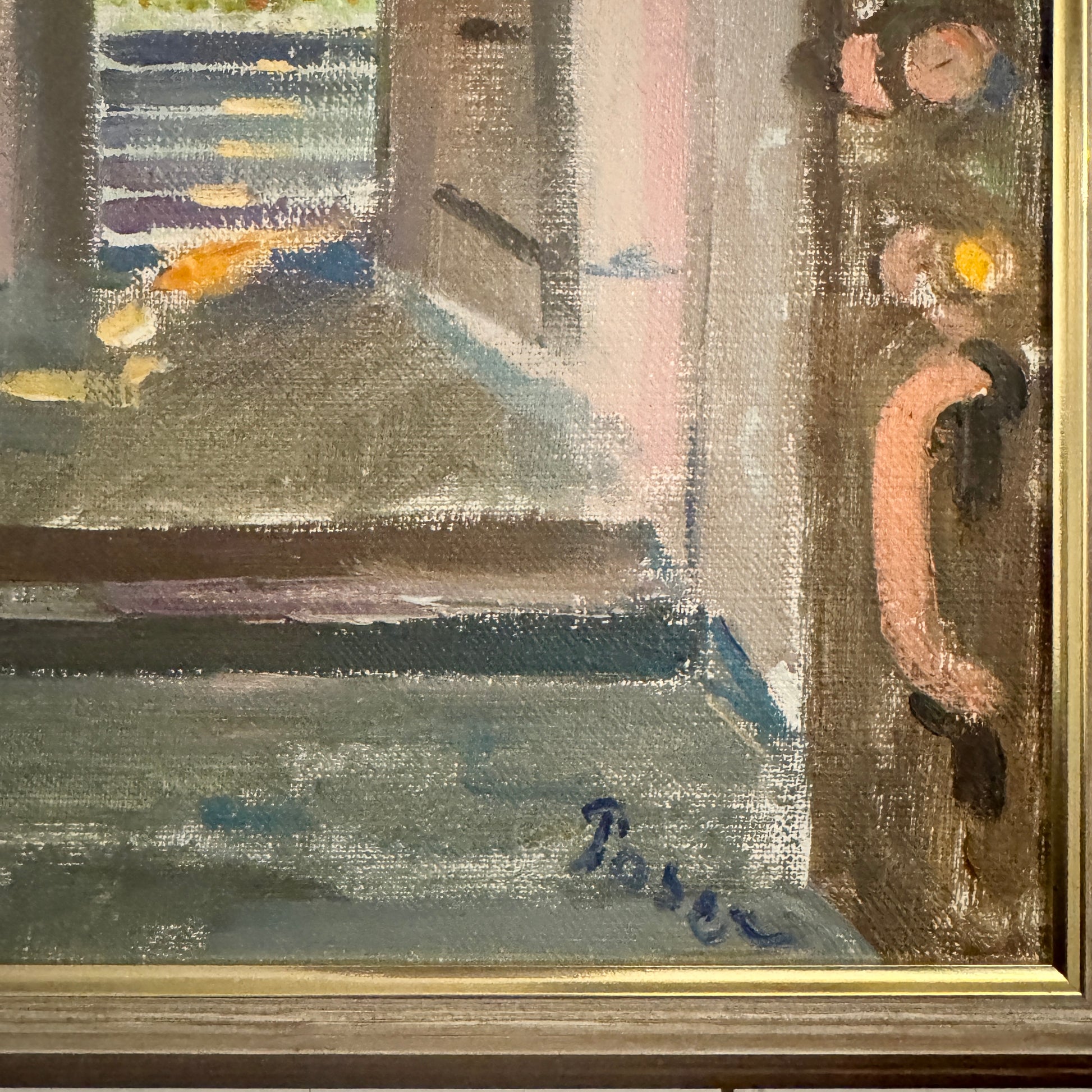 Executed with confident, expressive brushwork and a balanced mid-century palette, the composition contrasts the subdued interior with the brighter outdoor scene, creating a calm sense of movement and contemplation.