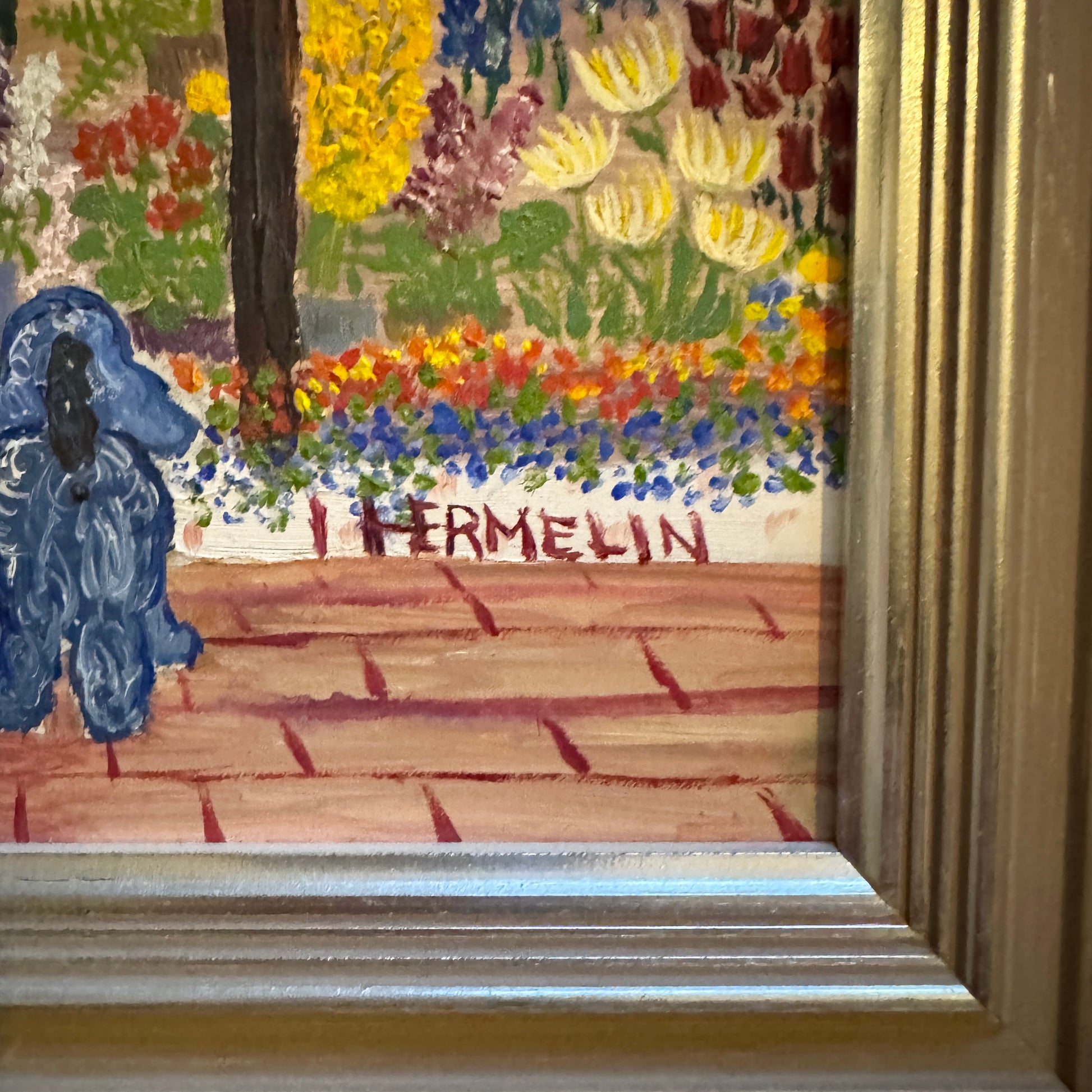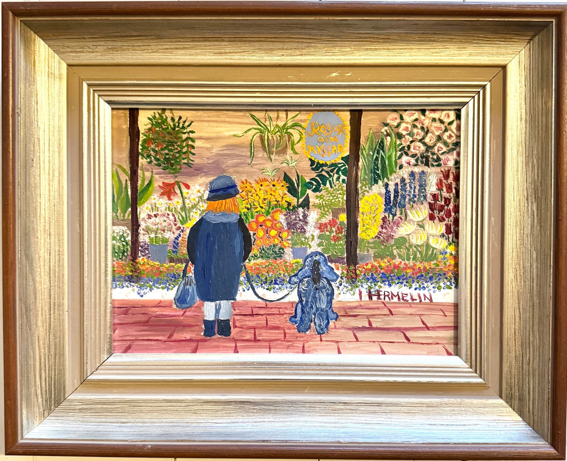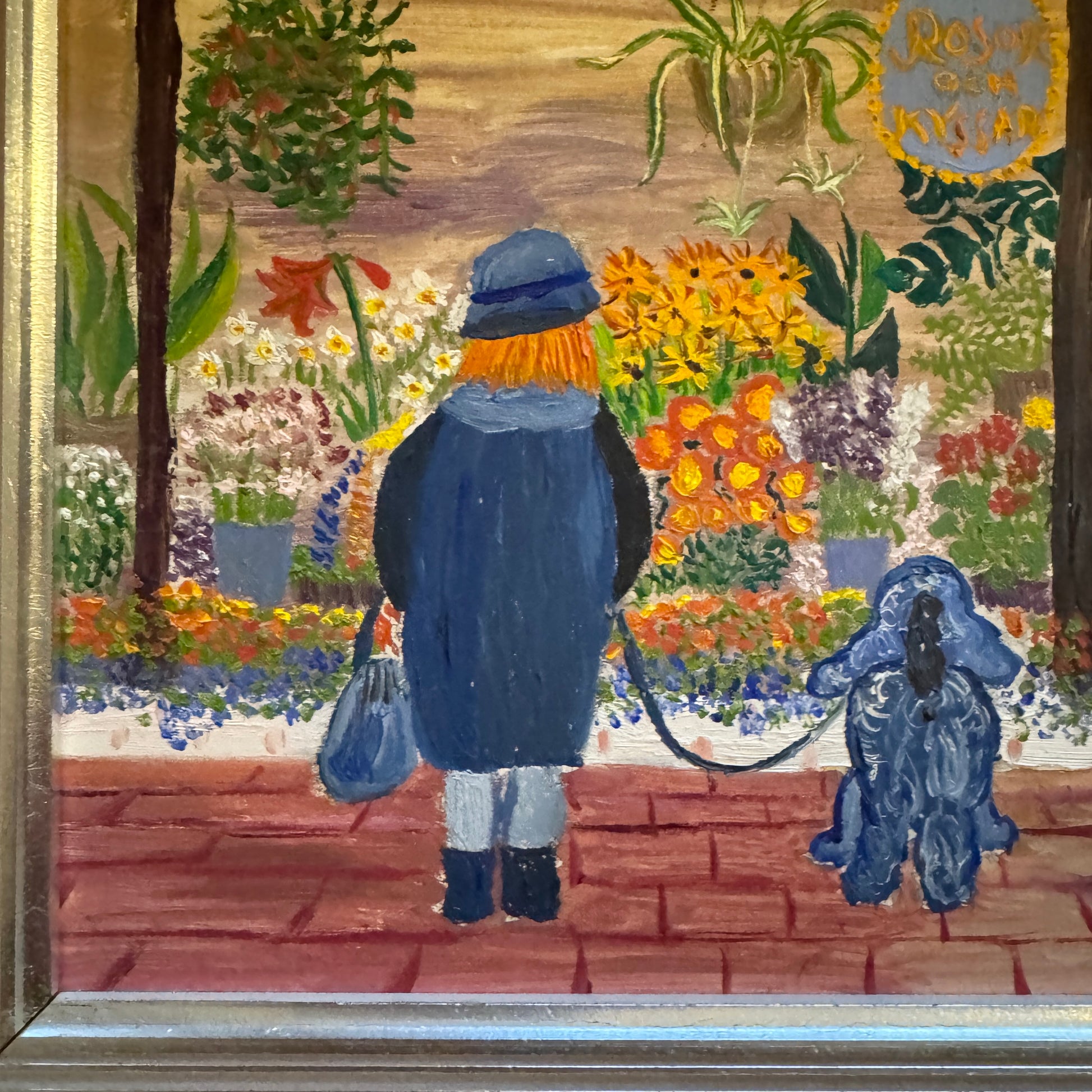 A warm and charming vintage oil by Swedish artist Inga Hermelin, capturing a quiet, intimate moment on a flower-lined street. A woman, seen from behind, walks hand in hand with her small dog, pausing before an abundant display of roses and blossoms. The naïve, expressive brushwork and joyful palette lend the scene a gentle, storybook quality, where everyday life feels tender and unhurried.