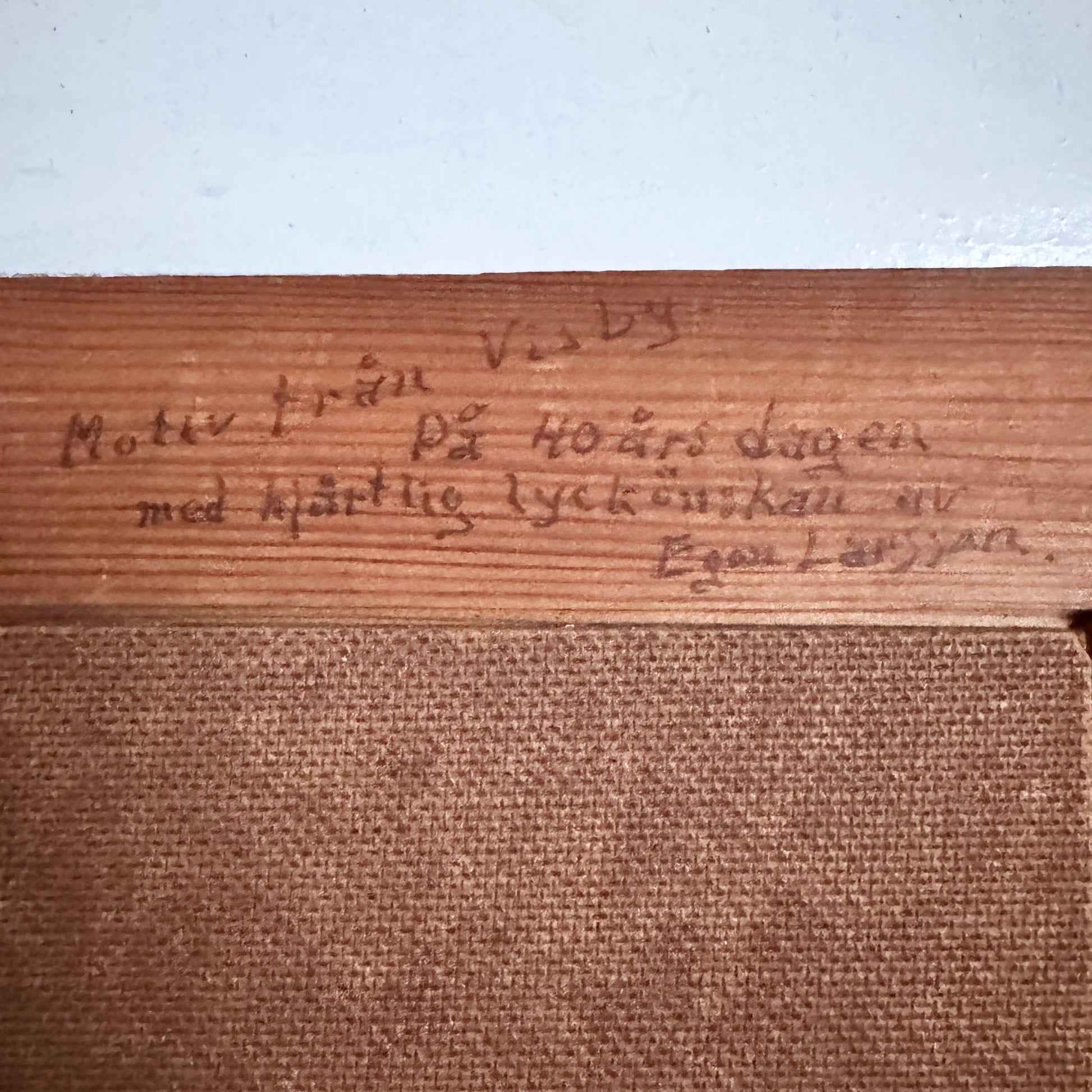A moody and evocative 1945 oil painting by Swedish artist Egon Larsson, depicting the ancient ruins of Visby on Gotland. Soft, dusk-toned light settles over the shoreline while the weathered stone walls rise like quiet sentinels against a drifting sky. Larsson captures the scene with a gentle, almost dreamlike touch, shadows, mist, and old history blending into one poetic composition.