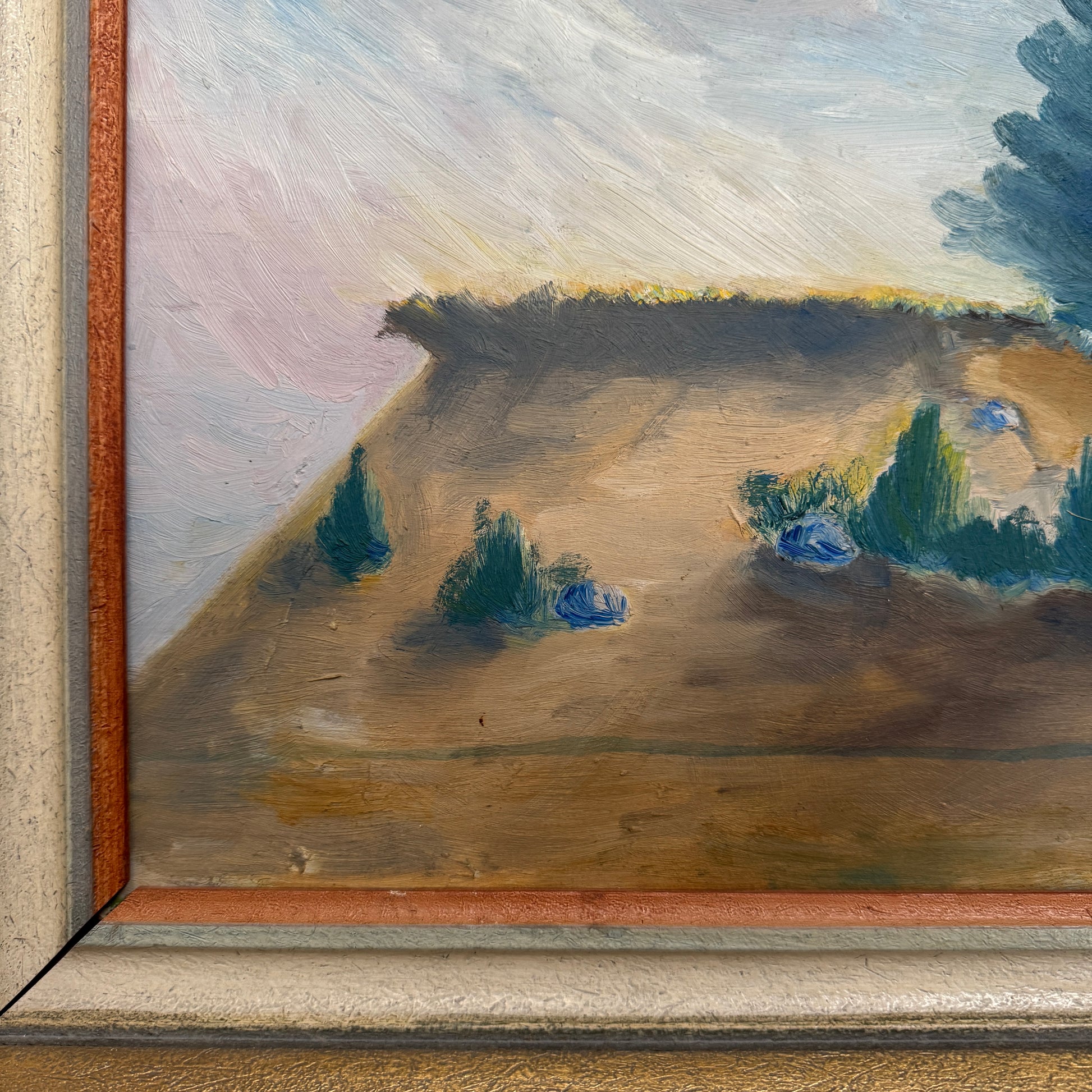 The artist employs loose, confident brushstrokes and a restrained palette of sandy ochres, soft blues and muted greens. The forms are treated in a semi-abstract manner, with simplified shapes and expressive paint handling that gives the work a modern, almost lyrical character typical of post-war Nordic landscape painting.