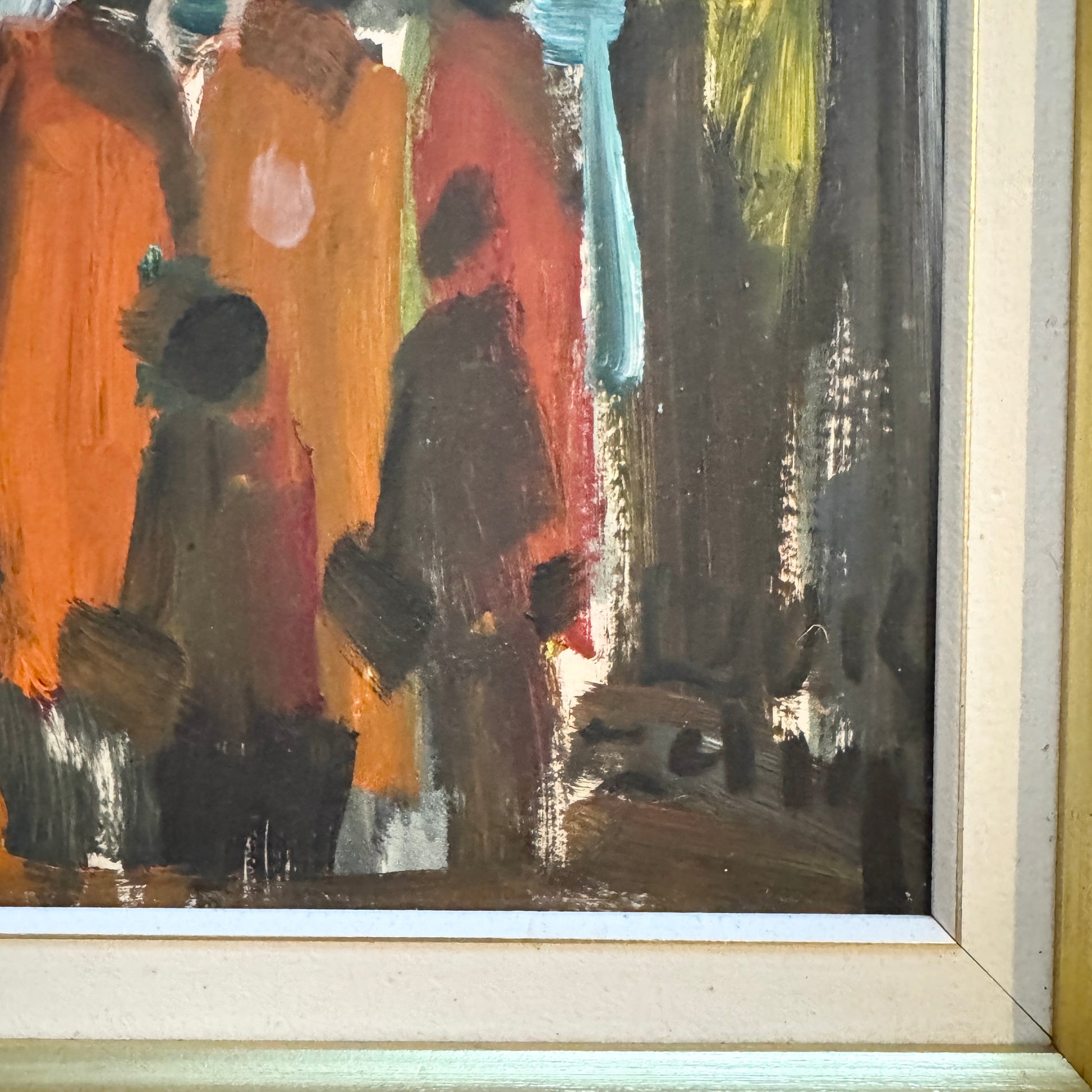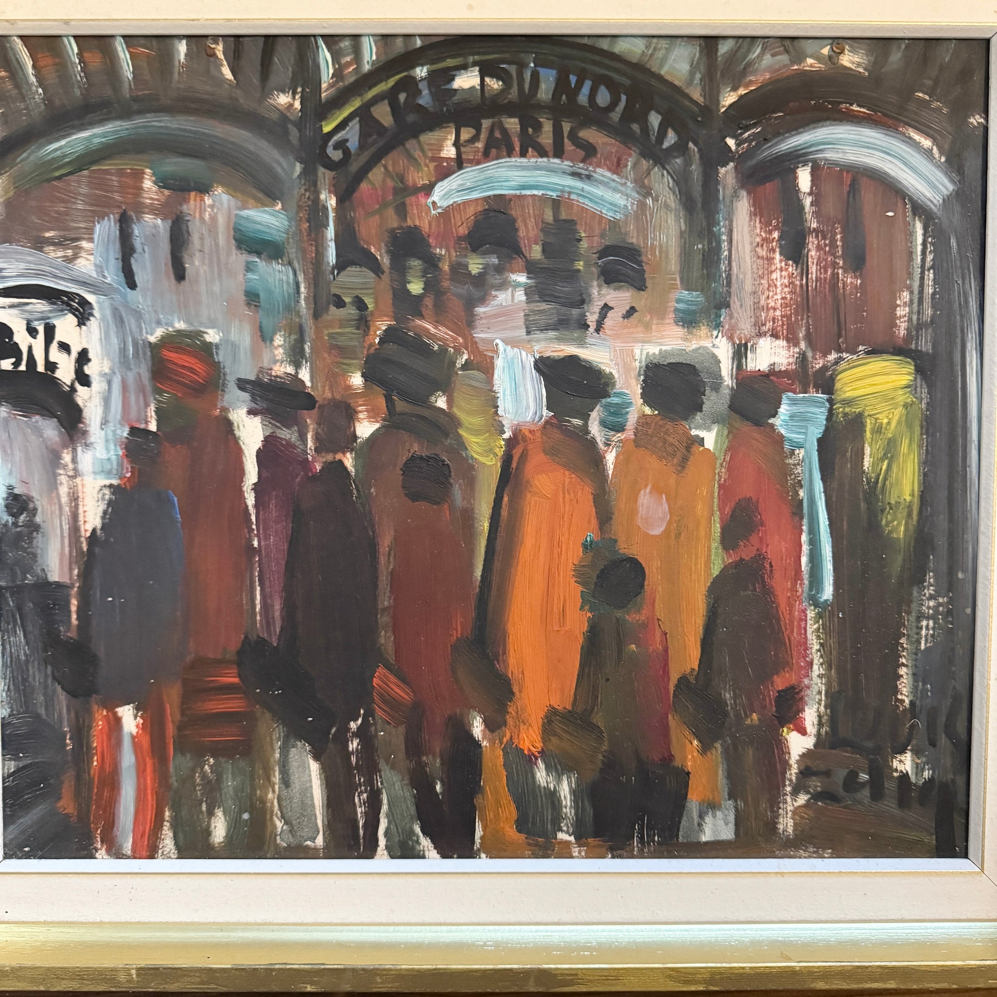 This powerful painting depicts a Parisian street scene rendered with expressive, almost anonymous figures gathered beneath an arched passage. Painted with broad, confident brushstrokes, the composition emphasizes movement, crowd, and atmosphere rather than individual identity. The figures merge into one another, forming a living rhythm of color — ochres, rusts, charcoal blacks, and muted blues — evoking the pulse of the city.