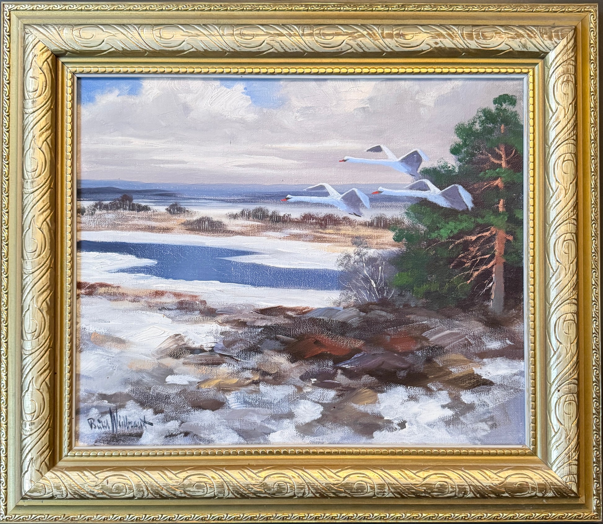 White Wings in Flight. Vintage Swedish Oil Painting by Bertil Widbrant